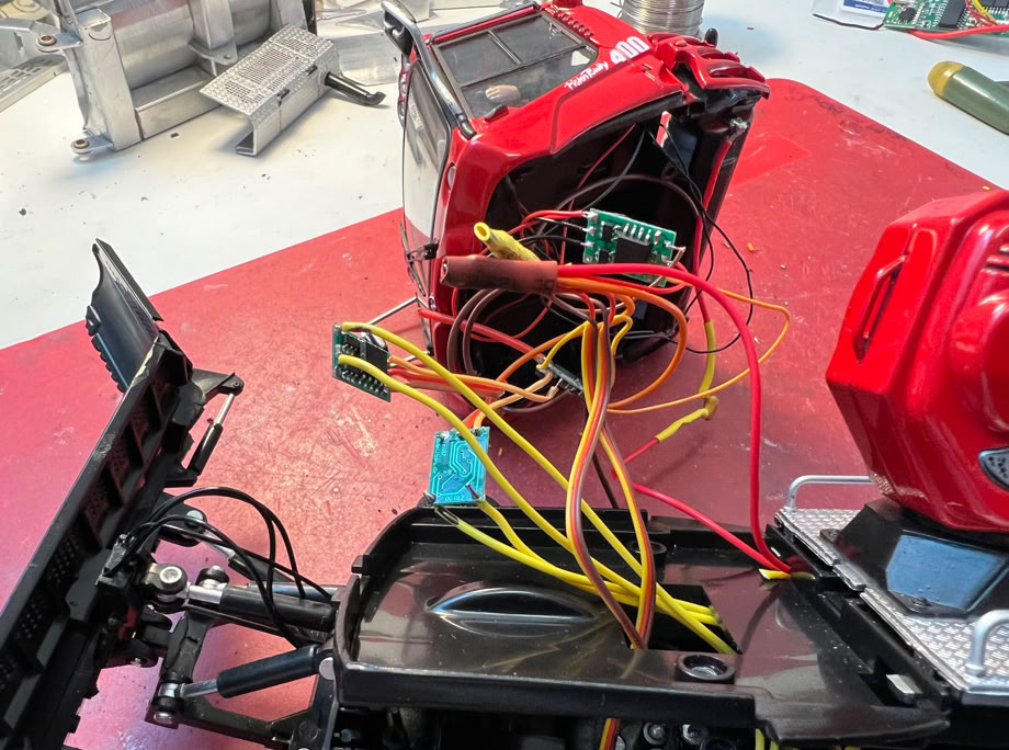 In spring 2022, I replaced the original electronics. The stiff wires kept breaking at the solder joints, and the included remote control didn't allow for precise control. I installed micro receivers, speed controllers, and switches from Sol Expert Group. This allowed me to use my Spektrum DX transmitter for control.
