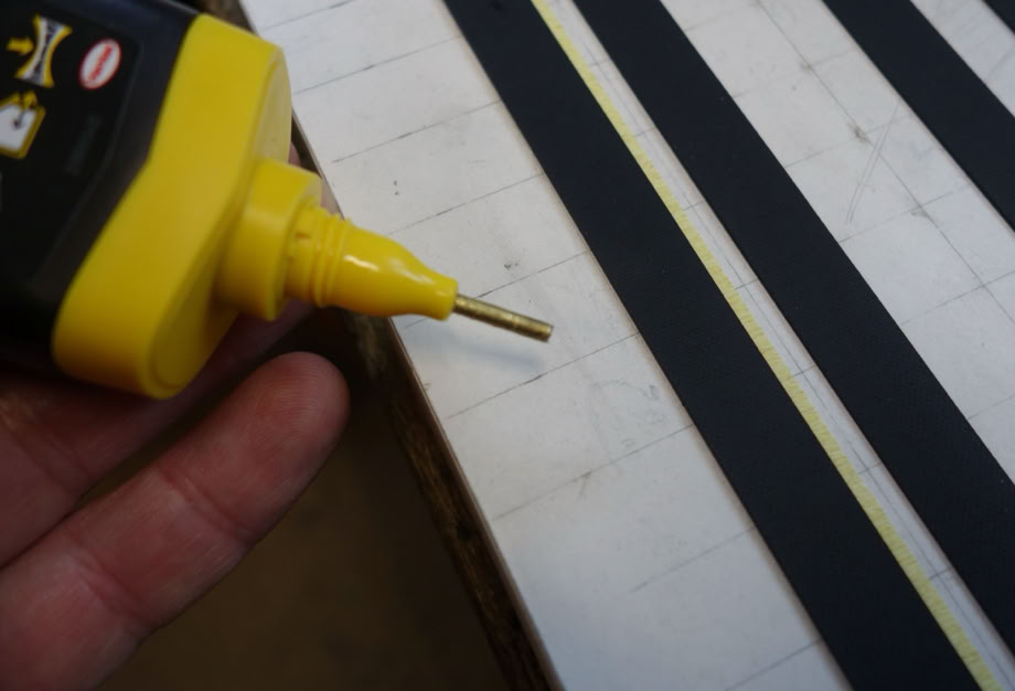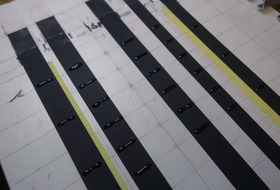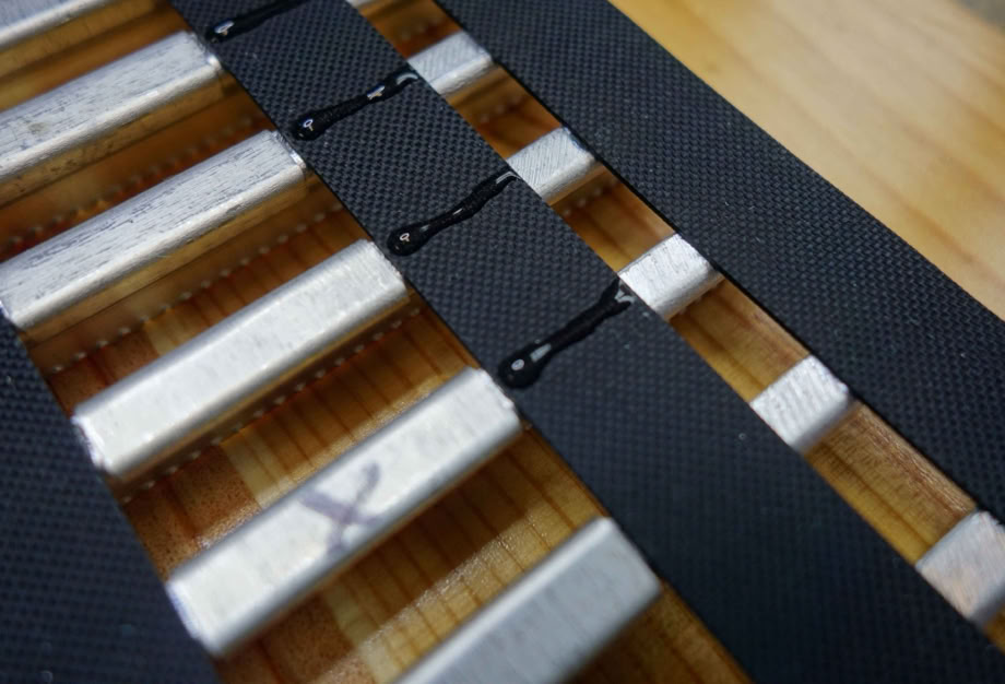 Da kommt gaaaanz sparsam Sekundenkleber rein, um das Band danach sofort plan auf die Unterlage zu drücken. Aktivator drauf und 3sec. warten, - fertig.