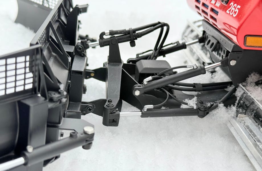 The front attachment carrier is a very interesting design. For whatever reason, Ratrac didn't use the now ubiquitous ball joint, but instead implemented each joint for the four functions separately: