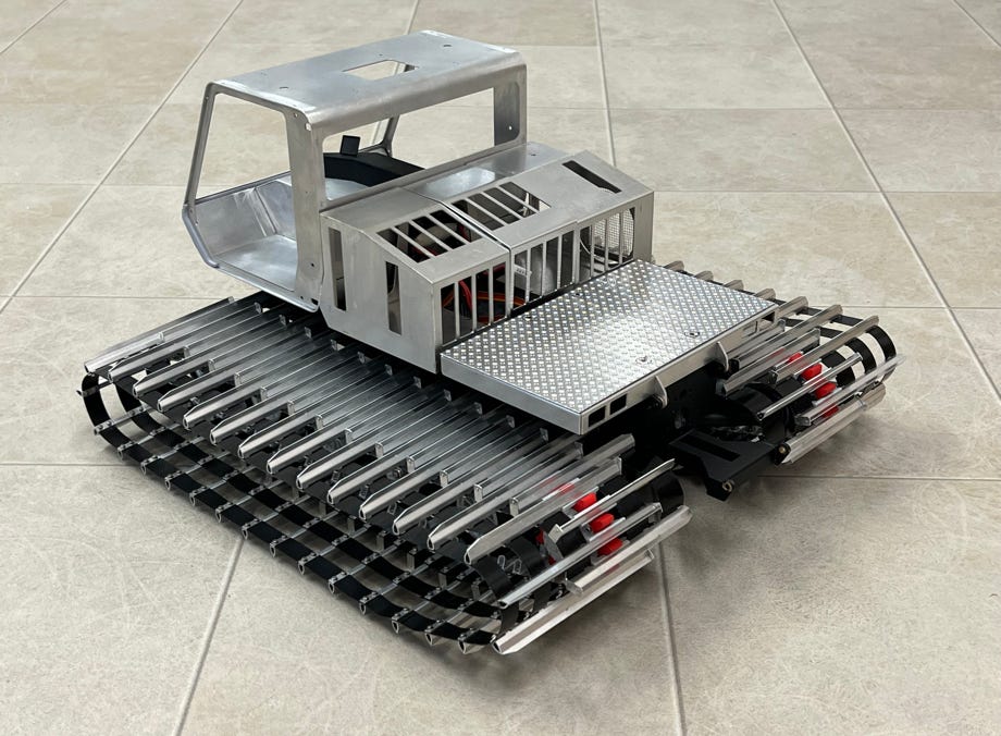 Proven components from Pistenking were used for the swingarms, as well as for the chain tensioning, which is designed separately for each chain. This will certainly bring advantages when driving. The drive itself is via Pistenking flex shafts with noble Maxon geared motors, which I also use in the PB100 and PB400. Unfortunately, if you need the space, you can't get around these expensive parts.