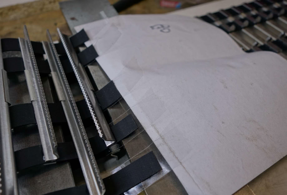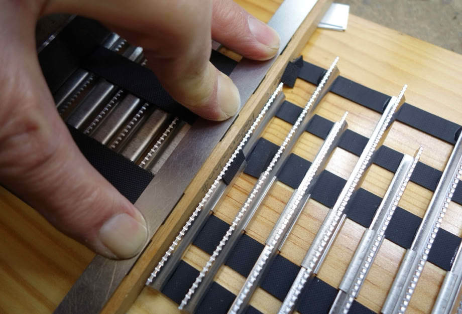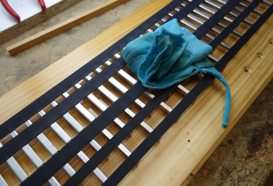 Da die profilierten Stege oft minimal schüsseln, päppe ich unter die zwei äußersten Bänder eine Lage Kreppband.