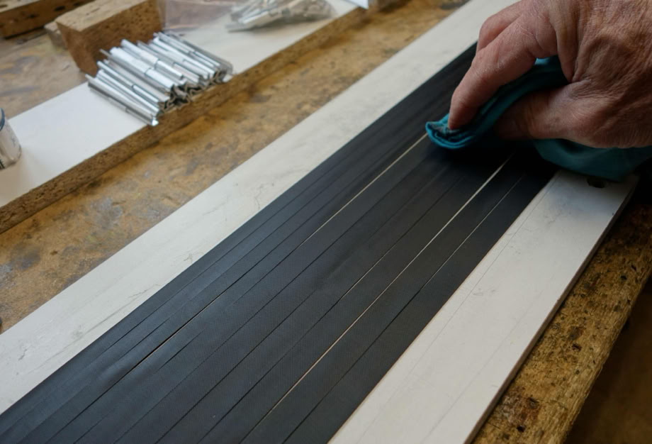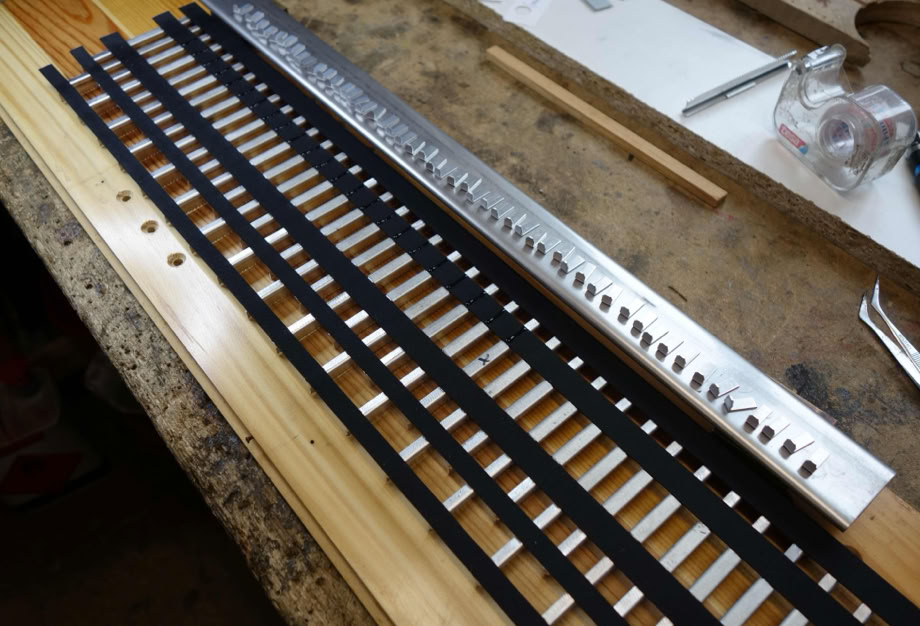 Die Bänder haben jetzt die richtige Länge, sie liegt auf den Stegen und wird jetzt mit Nitro sauber abgewischt. Anschließend gut ablüften lassen!