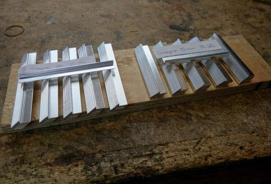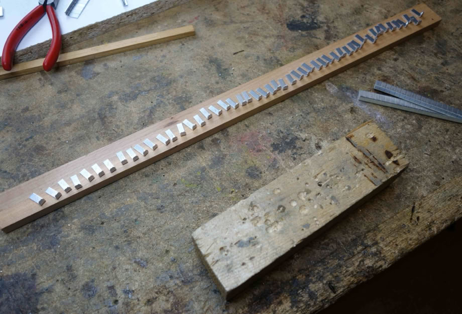 Jeder fertige Spurbügel wird dann nicht einfach auf einen Haufen geworfen, sondern gleich auf einem langen Brettchen abgelegt.