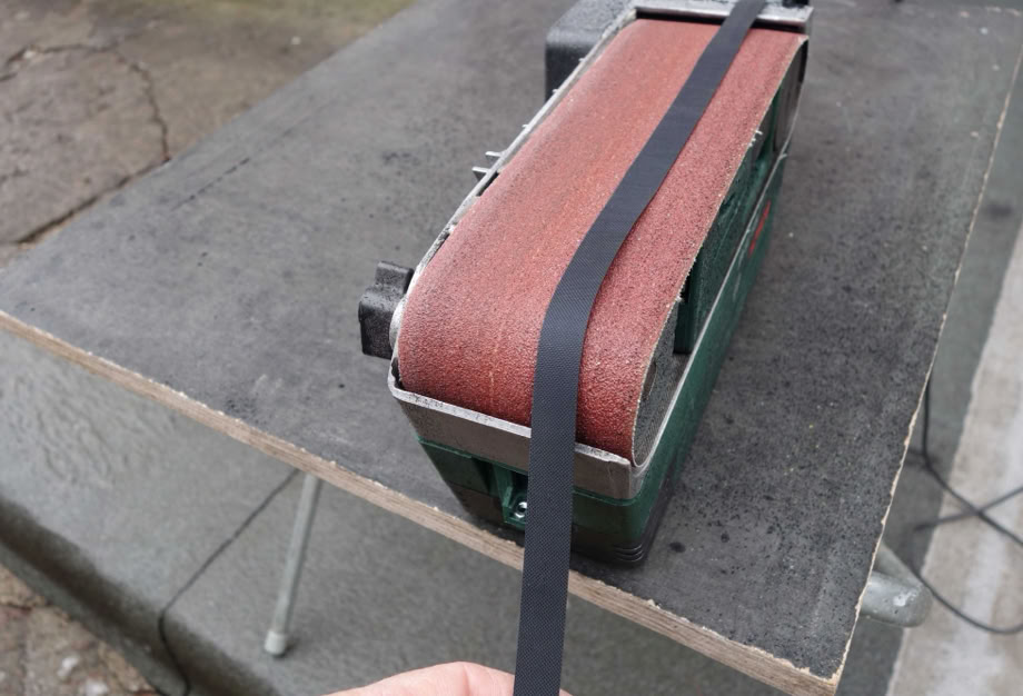 Sobald es das Wetter zulässt, kommen draußen die Bänder auf den Bandschleifer: